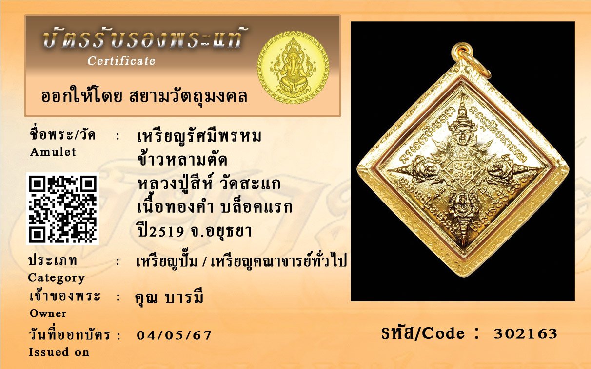 รหัสสินค้า : 302163 เหรียญรัศมีพรหม ข้าวหลามตัด หลวงปู่สีห์ วัดสะแก เนื้อทองคำ บล็อคแรก ปี2519 จ.อยุธยา