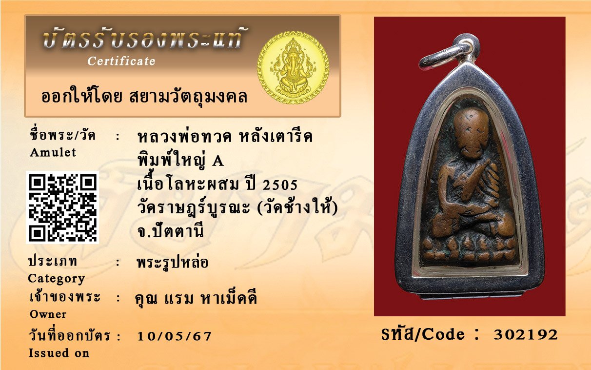 รหัสสินค้า : 302192 หลวงพ่อทวด หลังเตารีด พิมพ์ใหญ่ A เนื้อโลหะผสม ปี 2505 วัดราษฎร์บูรณะ (วัดช้างให้) จ.ปัตตานี
