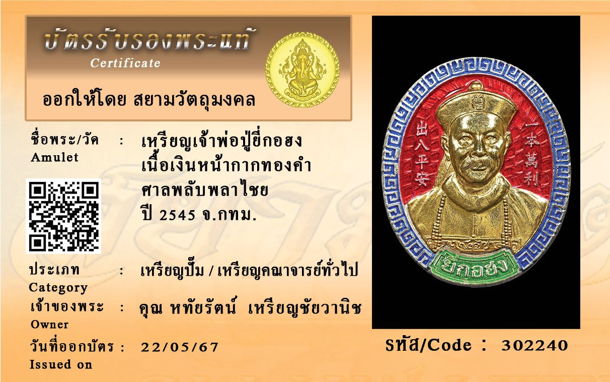 รหัสสินค้า : 302240 เหรียญเจ้าพ่อปู่ยี่กอฮง เนื้อเงินหน้ากากทองคำ ศาลพลับพลาไชย ปี 2545 จ.กทม.