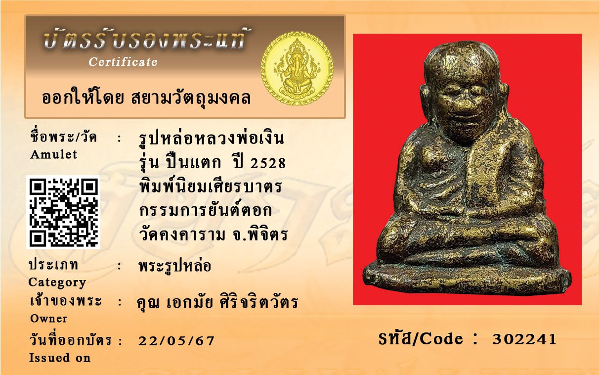 รหัสสินค้า : 302241 รูปหล่อหลวงพ่อเงิน รุ่น ปืนแตก ปี 2528 พิมพ์นิยมเศียรบาตร กรรมการยันต์ตอก วัดคงคาราม จ.พิจิตร