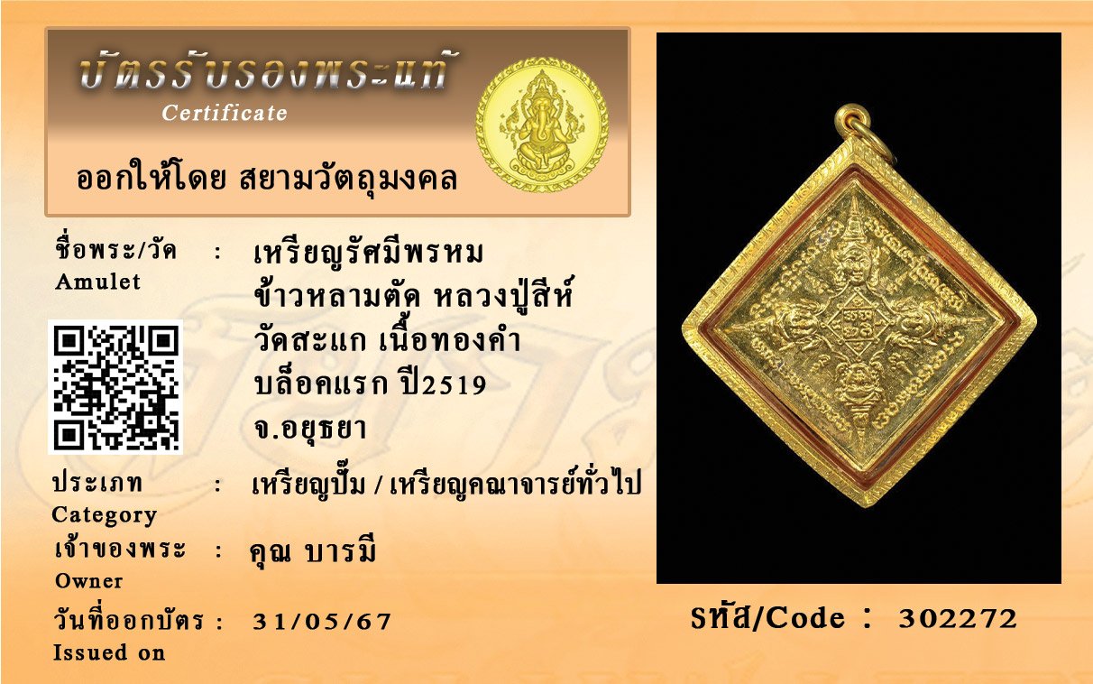 รหัสสินค้า : 302272 เหรียญรัศมีพรหม ข้าวหลามตัด หลวงปู่สีห์ วัดสะแก เนื้อทองคำ บล็อคแรก ปี2519 จ.อยุธยา