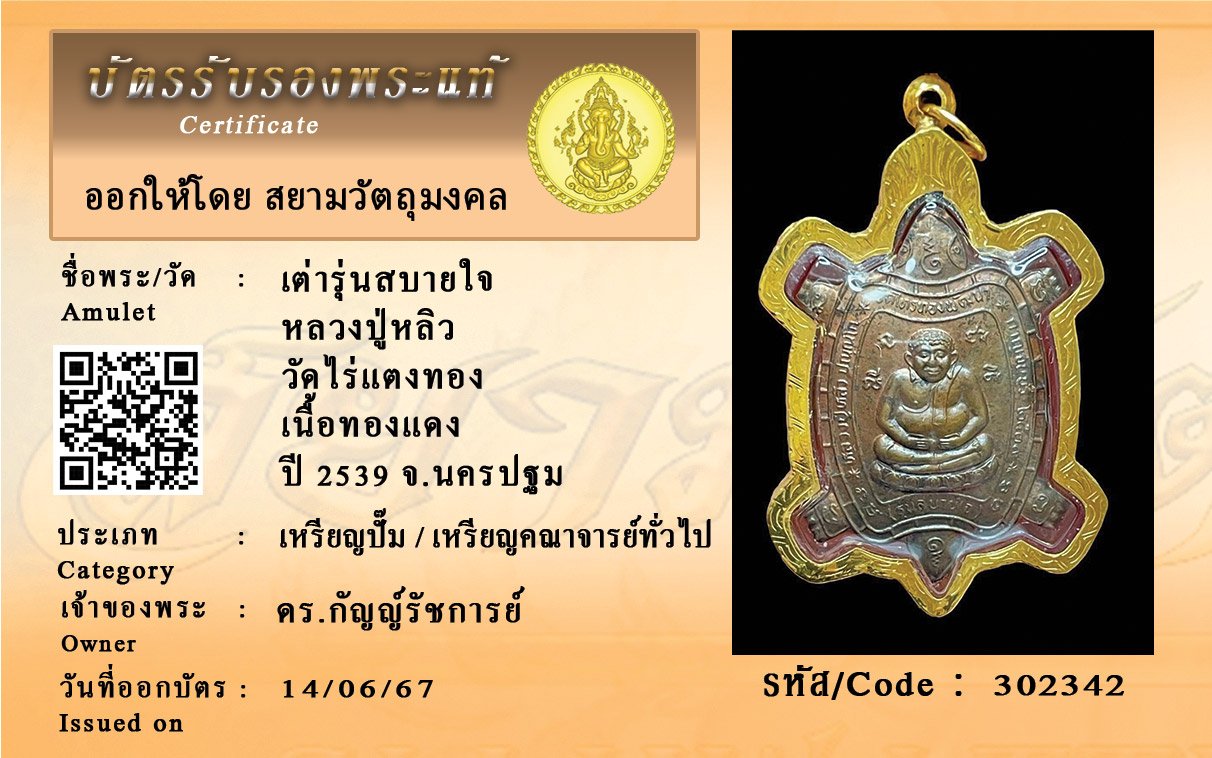 รหัสสินค้า : 302342 เต่ารุ่นสบายใจ หลวงปู่หลิว วัดไร่แตงทอง ปี 2539 เนื้อทองแดง จ.นครปฐม