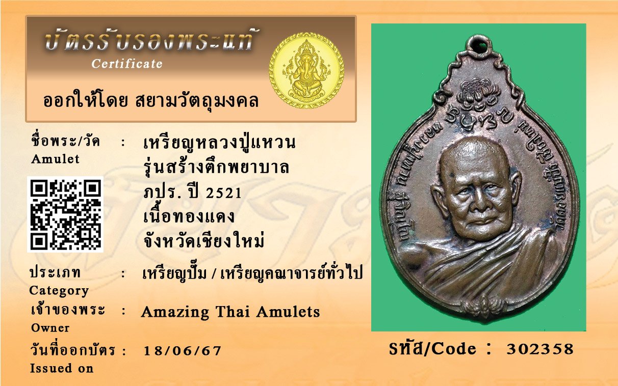 รหัสสินค้า : 302358 เหรียญหลวงปู่แหวน รุ่นสร้างตึกพยาบาล ภปร. ปี 2521 เนื้อทองแดง จังหวัดเชียงใหม่