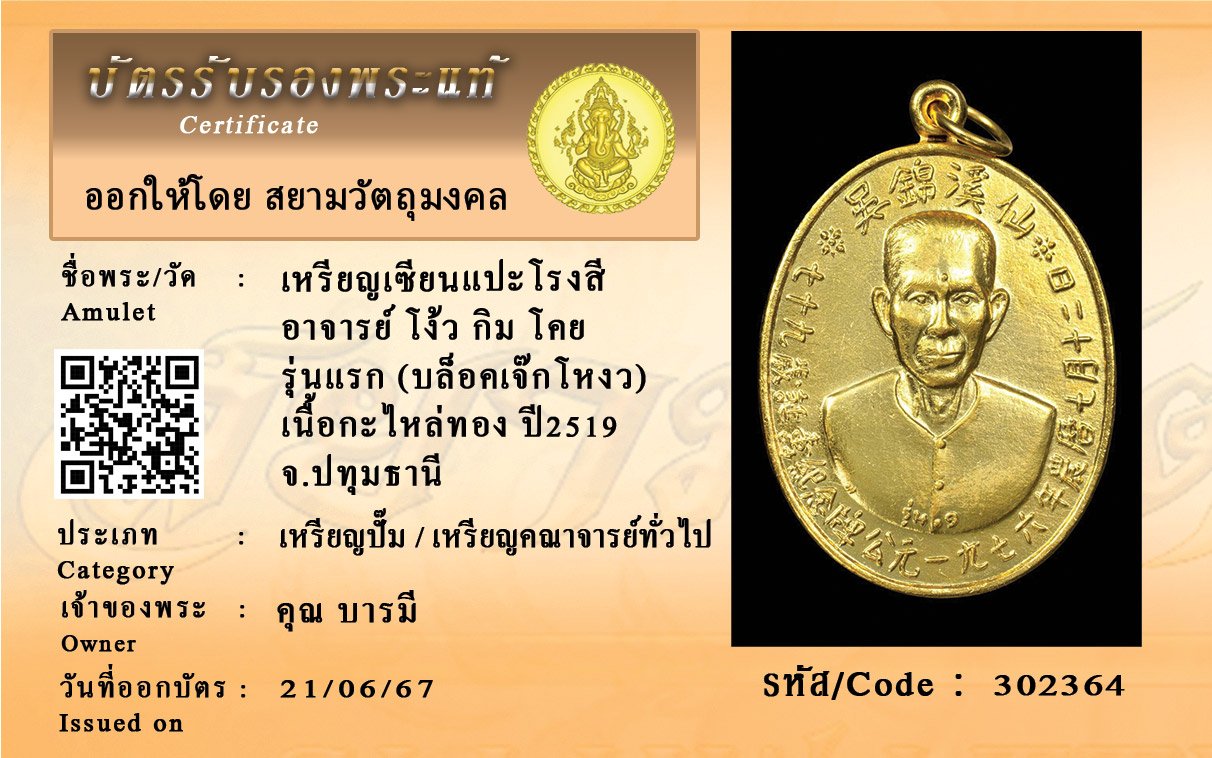 รหัสสินค้า : 302364 เหรียญเซียนแปะโรงสี อาจารย์ โง้ว กิม โคย รุ่นแรก (บล็อคเจ๊กโหงว) เนื้อกะไหล่ทอง ปี2519 จ.ปทุมธานี