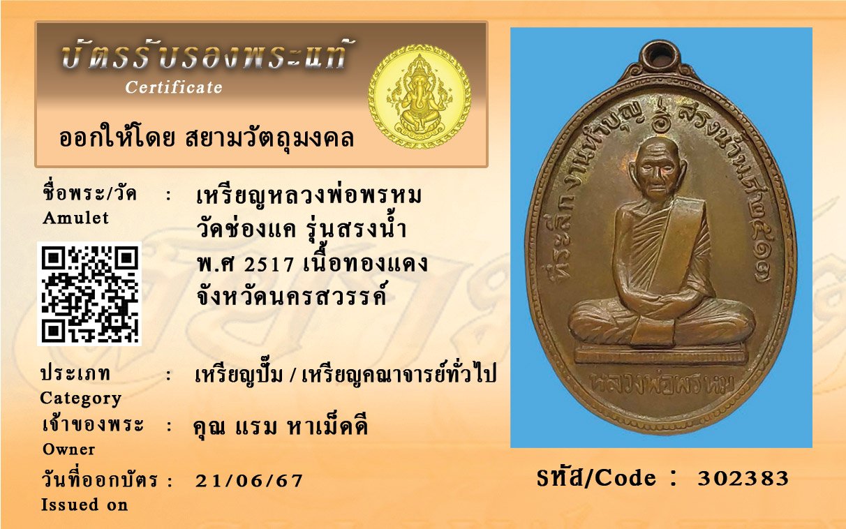รหัสสินค้า : 302383 เหรียญหลวงพ่อพรหม วัดช่องแค รุ่นสรงน้ำ พ.ศ 2517 เนื้อทองแดง จังหวัดนครสวรรค์