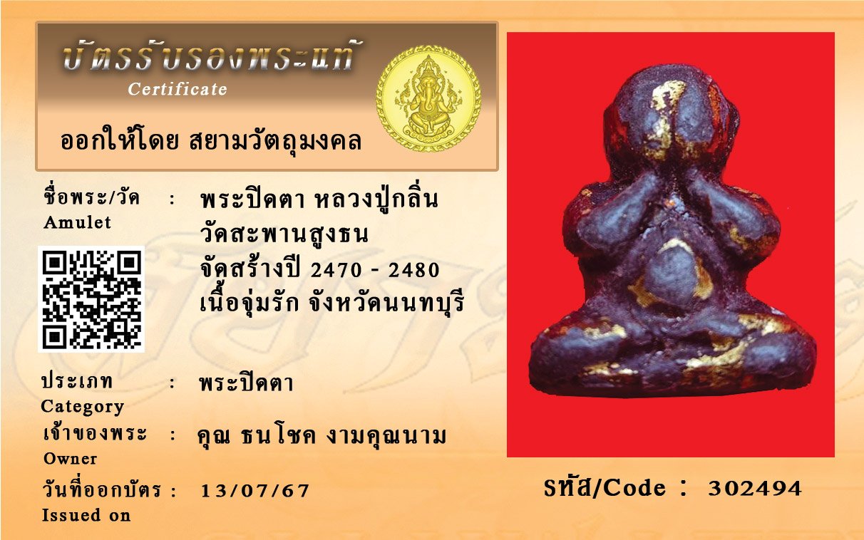 รหัสสินค้า : 302494 พระปิดตา หลวงปู่กลิ่น วัดสะพานสูงธน จัดสร้างปี 2470 - 2480 เนื้อจุ่มรัก จังหวัดนนทบุรี