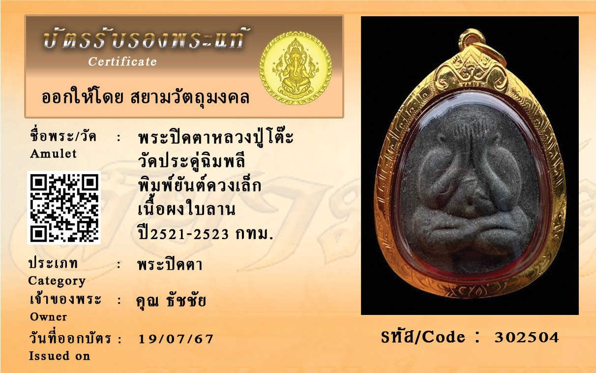 รหัสสินค้า : 302504 พระปิดตาหลวงปู่โต๊ะ วัดประดู่ฉิมพลี พิมพ์ยันต์ดวงเล็ก เนื้อผงใบลาน ปี2521-2523 กทม.