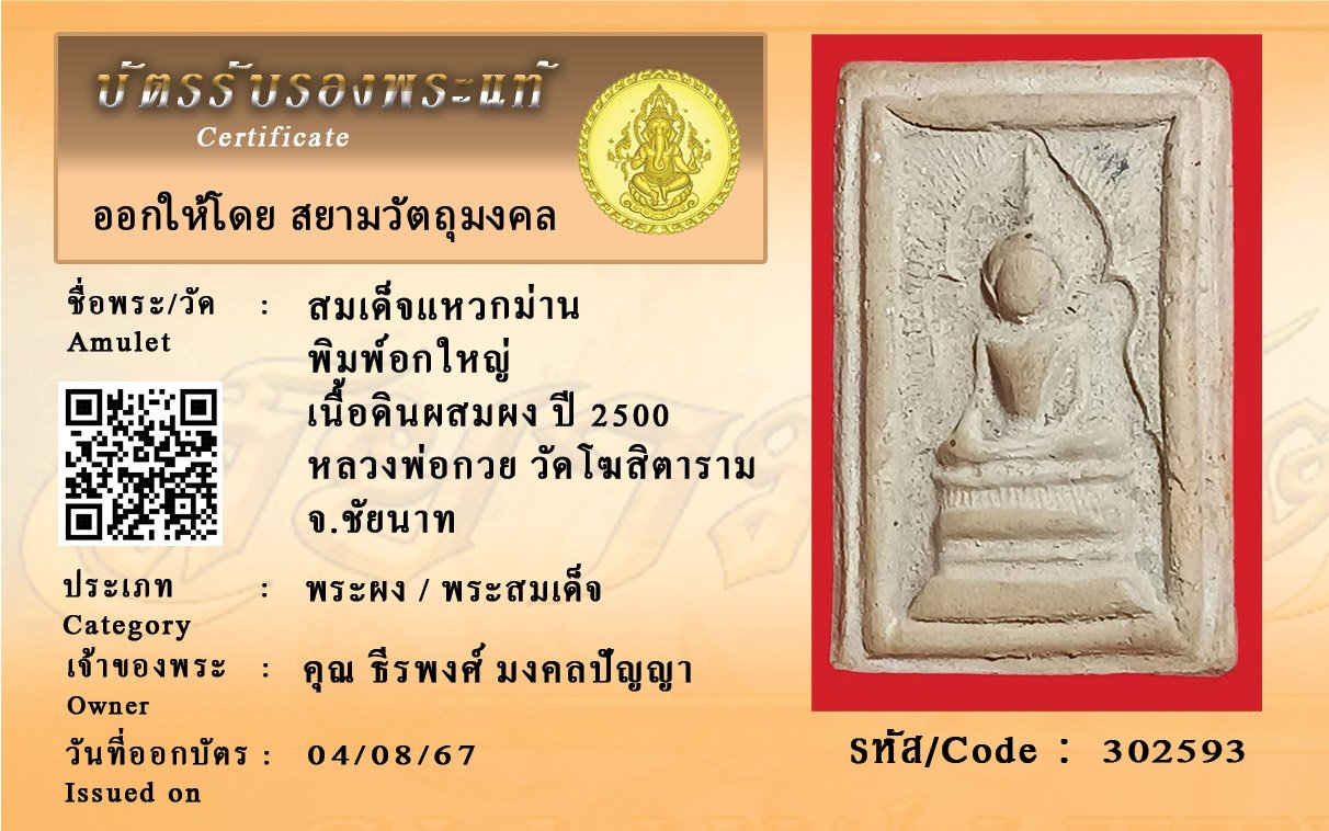 รหัสสินค้า : 302593 สมเด็จแหวกม่าน พิมพ์อกใหญ่ เนื้อดินผสมผง ปี 2500 หลวงพ่อกวย วัดโฆสิตาราม จ.ชัยนาท