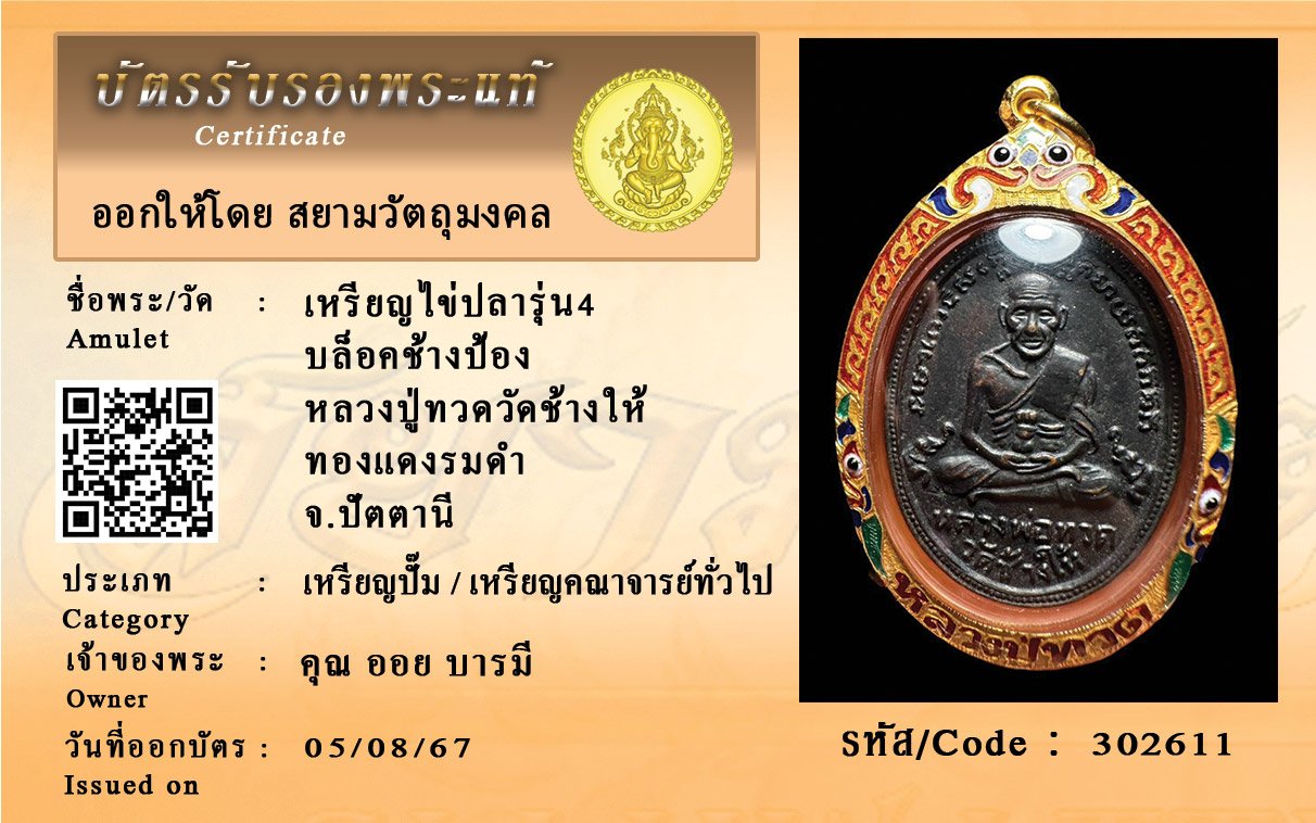 รหัสสินค้า : 302611 เหรียญไข่ปลารุ่น4 บล็อคช้างป้อง หลวงปู่ทวดวัดช้างให้ ทองแดงรมดำ จ.ปัตตานี