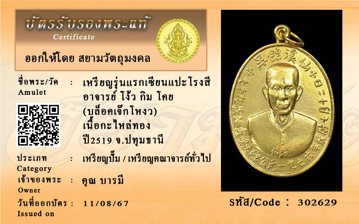 รหัสสินค้า : 302629 เหรียญรุ่นแรกเซียนแปะโรงสี อาจารย์ โง้ว กิม โคย (บล็อคเจ๊กโหงว) เนื้อกะไหล่ทอง ปี2519 จ.ปทุมธานี