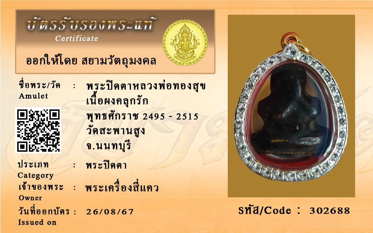 รหัสสินค้า : 302688 พระปิดตาหลวงพ่อทองสุข เนื้อผงคลุกรัก พุทธศักราช 2495 - 2515 วัดสะพานสูง จ.นนทบุรี