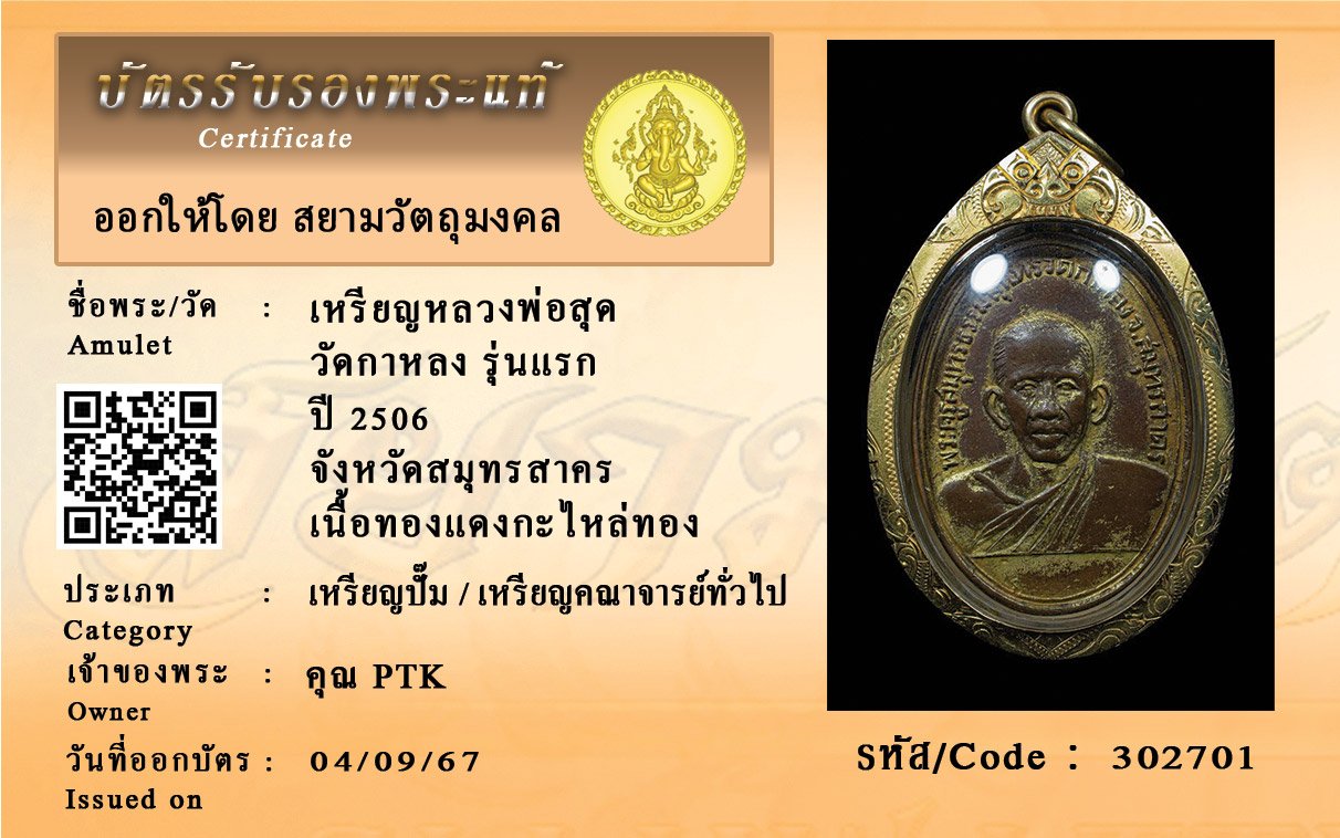 รหัสสินค้า : 302701 เหรียญหลวงพ่อสุด วัดกาหลง รุ่นแรก ปี 2506 จังหวัดสมุทรสาคร เนื้อทองแดงกะไหล่ทอง