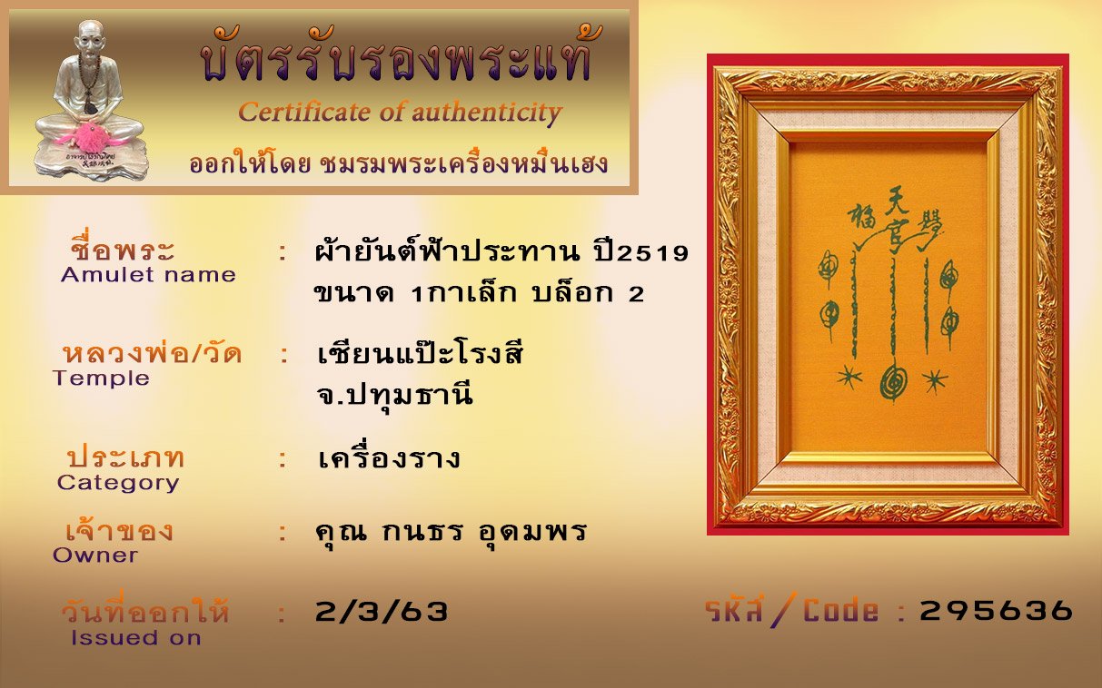 รหัสสินค้า : (295636) ผ้ายันต์ฟ้าประทาน ปี2519 ขนาด 1กาเล็ก บล็อก2 เซียนแป๊ะโรงสี ปทุมธานี