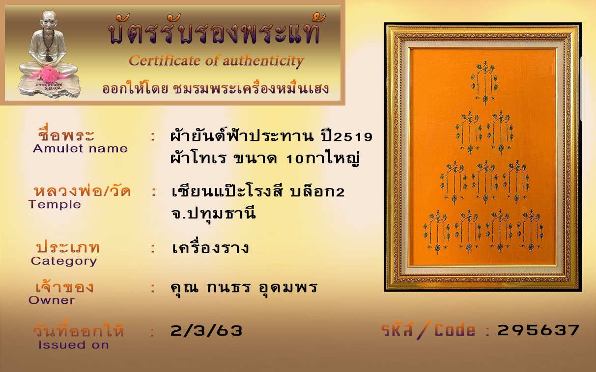 รหัสสินค้า : (295637) ผ้ายันต์ฟ้าประทาน ปี2519 ขนาด 10กาใหญ่ บล็อก2 เซียนแป๊ะโรงสี ปทุมธานี