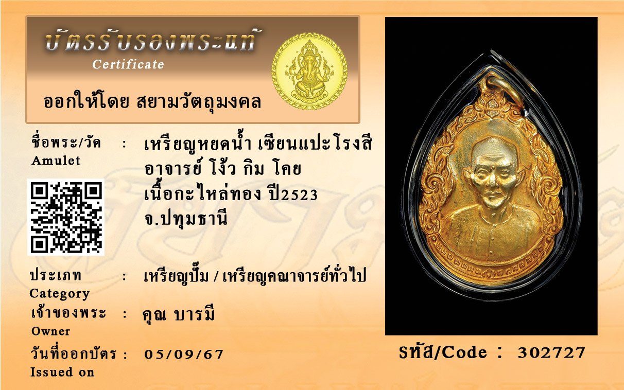 รหัสสินค้า : 302727 เหรียญหยดน้ำ เซียนแปะโรงสี อาจารย์ โง้ว กิม โคย เนื้อกะไหล่ทอง ปี2523 จ.ปทุมธานี