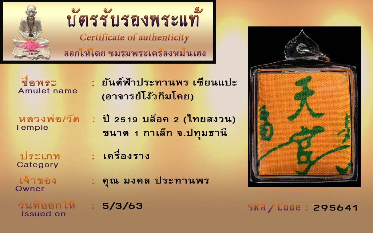 รหัสสินค้า : (295641) ยันต์ฟ้าประทานพร เซียนแปะ (อาจารย์โง้วกิมโคย) ปี2519 บล็อค2 (ไทยสงวน) ขนาด1กาเล็ก จ.ปทุมธานี