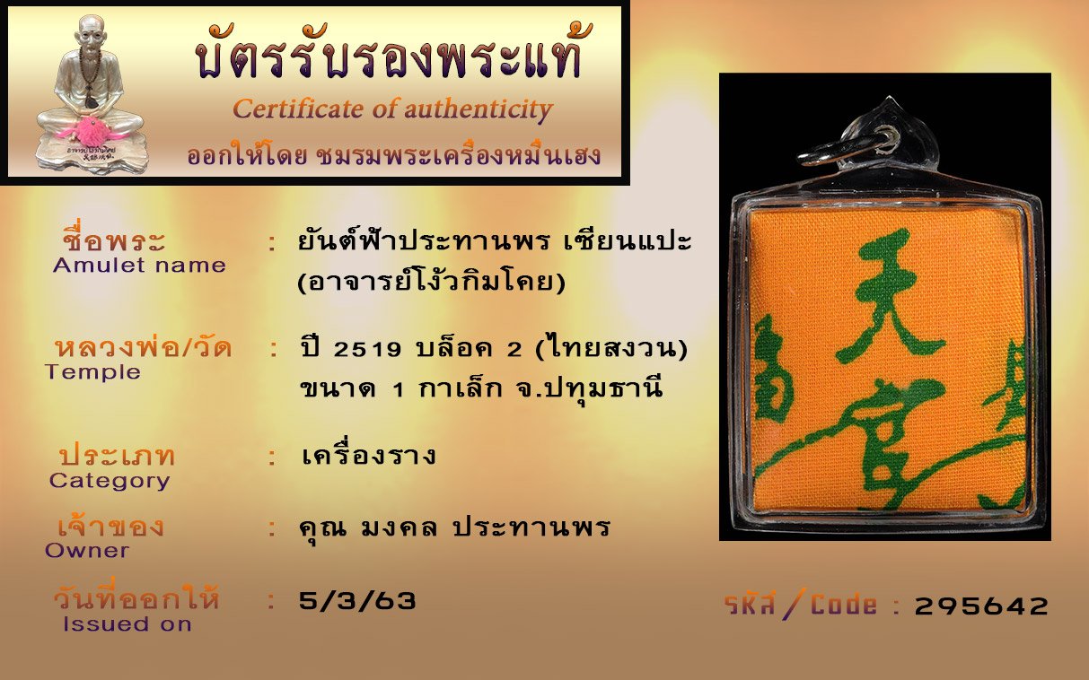 รหัสสินค้า : (295642) ยันต์ฟ้าประทานพร เซียนแปะ (อาจารย์โง้วกิมโคย) ปี2519 บล็อค2 (ไทยสงวน) ขนาด1กาเล็ก จ.ปทุมธานี