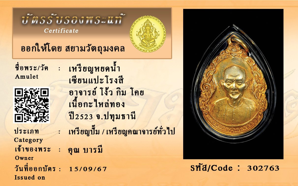 รหัสสินค้า : 302763 เหรียญหยดน้ำ เซียนแปะโรงสี อาจารย์ โง้ว กิม โคย เนื้อกะไหล่ทอง ปี2523 จ.ปทุมธานี