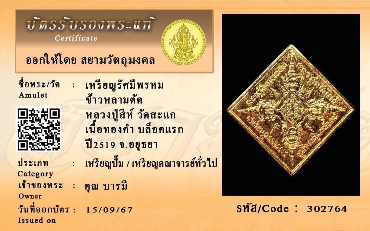 รหัสสินค้า : 302764 เหรียญรัศมีพรหม ข้าวหลามตัด หลวงปู่สีห์ วัดสะแก เนื้อทองคำ บล็อคแรก ปี2519 จ.อยุธยา