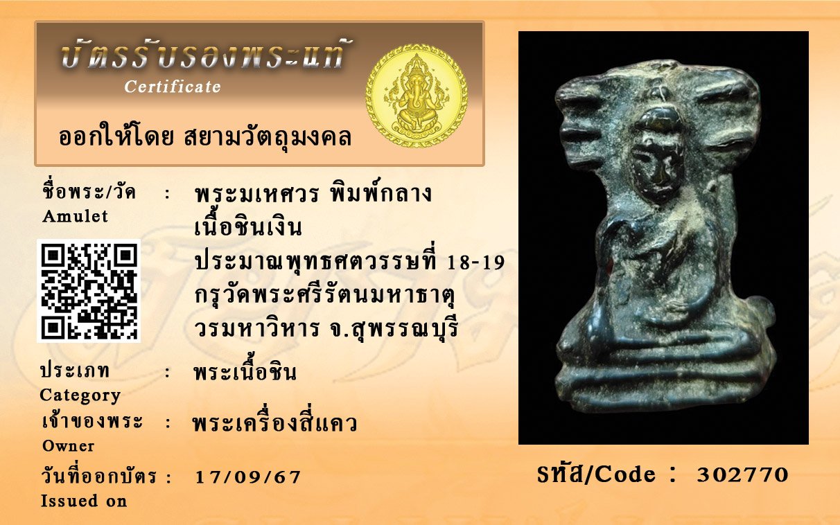 รหัสสินค้า : 302770 พระมเหศวร พิมพ์กลาง เนื้อชินเงิน ประมาณพุทธศตวรรษที่ 18-19 กรุวัดพระศรีรัตนมหาธาตุ วรมหาวิหาร จ.สุพรรณบุรี