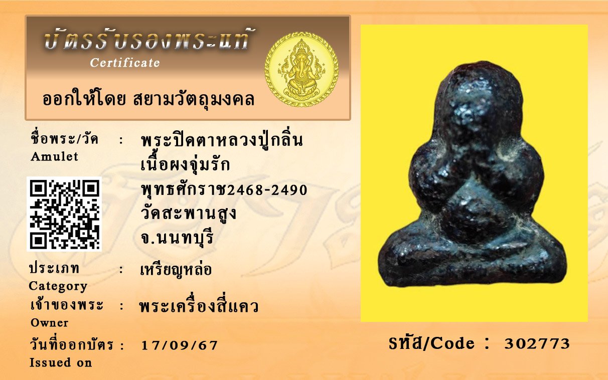 รหัสสินค้า : 302773 พระปิดตาหลวงปู่กลิ่น เนื้อผงจุ่มรัก พุทธศักราช2468-2490 วัดสะพานสูง จ.นนทบุรี