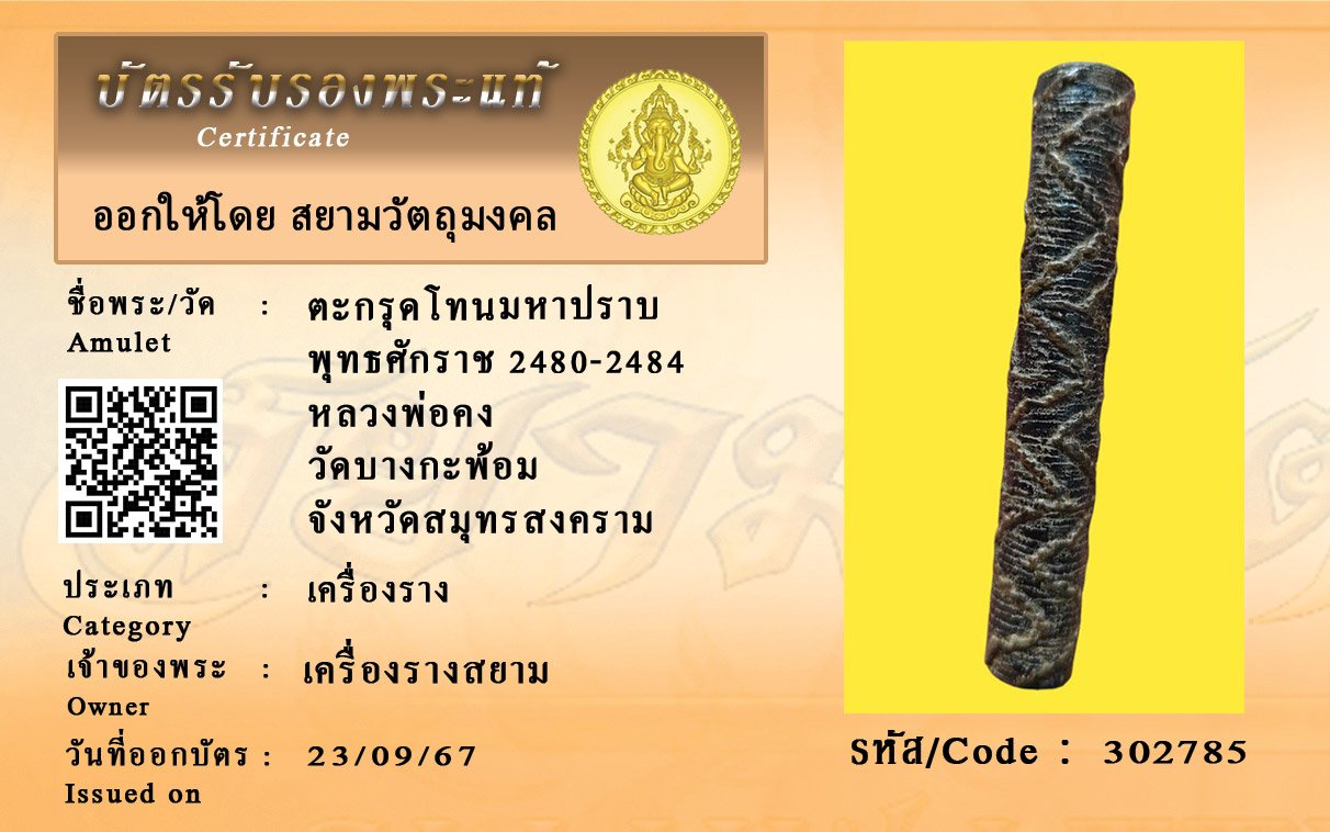 รหัสสินค้า : 302785 ตะกรุดโทนมหาปราบ พุทธศักราช 2480-2484 หลวงพ่อคง วัดบางกะพ้อม จังหวัดสมุทรสงคราม