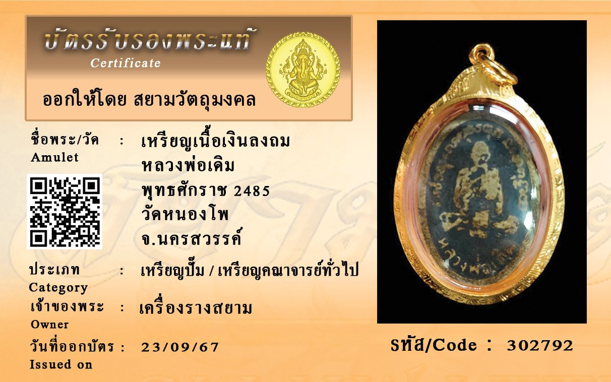 รหัสสินค้า : 302792 เหรียญเนื้อเงินลงถม หลวงพ่อเดิม พุทธศักราช 2485 วัดหนองโพ จ.นครสวรรค์