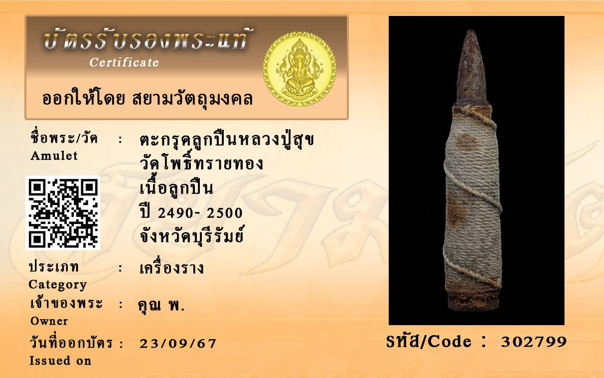 รหัสสินค้า : 302799 ตะกรุดลูกปืนหลวงปู่สุข วัดโพธิ์ทรายทอง เนื้อลูกปืน ปี 2490- 2500 จังหวัดบุรีรัมย์