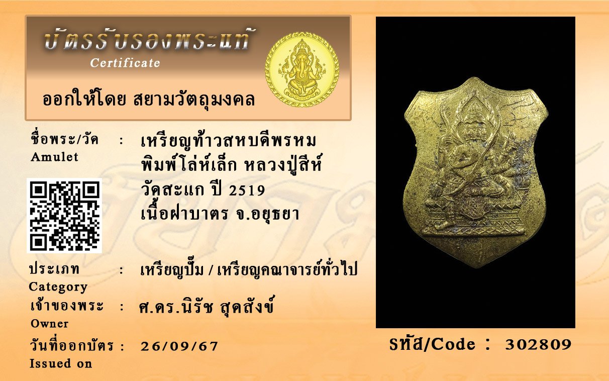 รหัสสินค้า : 302809 เหรียญท้าวสหบดีพรหม พิมพ์โล่ห์เล็ก หลวงปู่สีห์ วัดสะแก ปี 2519 เนื้อฝาบาตร จ.อยุธยา