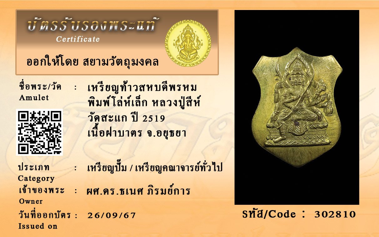 รหัสสินค้า : 302810 เหรียญท้าวสหบดีพรหม พิมพ์โล่ห์เล็ก หลวงปู่สีห์ วัดสะแก ปี 2519 เนื้อฝาบาตร จ.อยุธยา