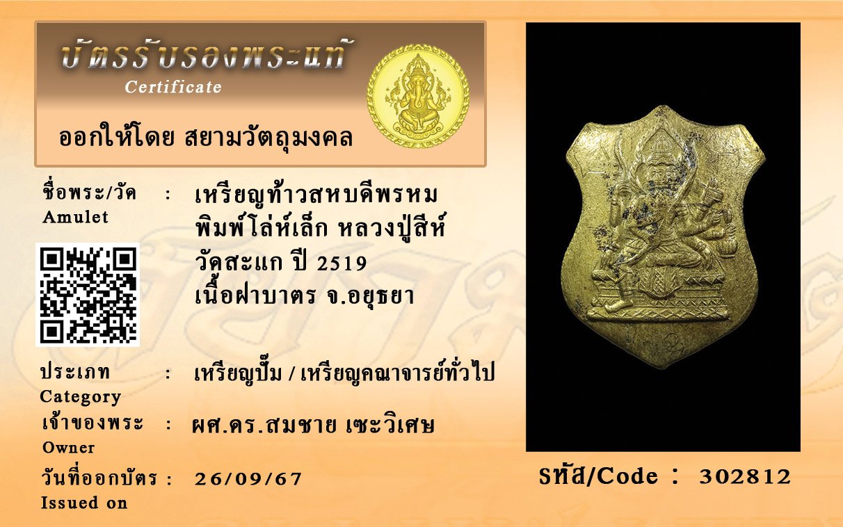 รหัสสินค้า : 302812 เหรียญท้าวสหบดีพรหม พิมพ์โล่ห์เล็ก หลวงปู่สีห์ วัดสะแก ปี 2519 เนื้อฝาบาตร จ.อยุธยา