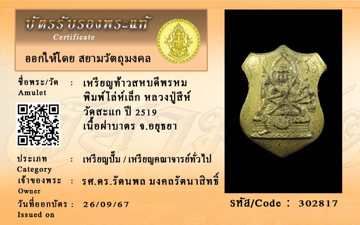 รหัสสินค้า : 302817 เหรียญท้าวสหบดีพรหม พิมพ์โล่ห์เล็ก หลวงปู่สีห์ วัดสะแก ปี 2519 เนื้อฝาบาตร จ.อยุธยา