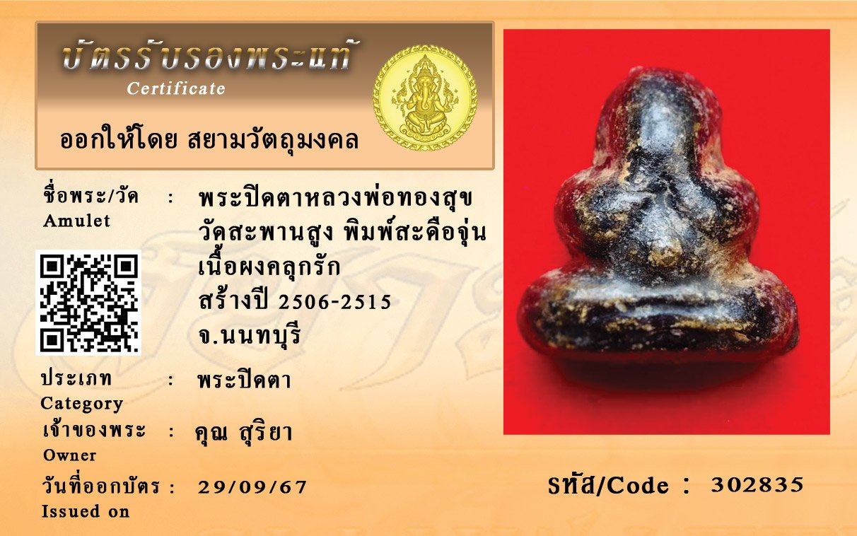 รหัสสินค้า : 302835 พระปิดตาหลวงพ่อทองสุข วัดสะพานสูง พิมพ์สะดือจุ่น เนื้อผงคลุกรัก สร้างปี 2506-2515 จ.นนทบุรี