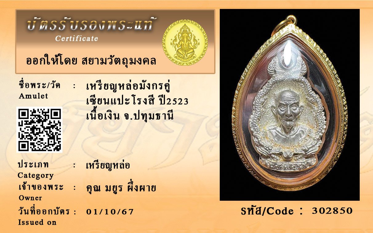 รหัสสินค้า : 302850 เหรียญหล่อมังกรคู่ เซียนแปะโรงสี ปี2523 เนื้อเงิน จ.ปทุมธานี