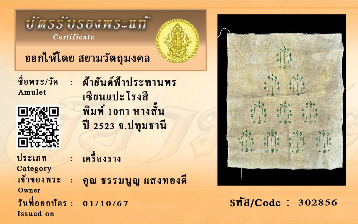 รหัสสินค้า : 302856 ผ้ายันต์ฟ้าประทานพร เซียนแปะโรงสี พิมพ์ 10กา หางสั้น ปี 2523 จ.ปทุมธานี