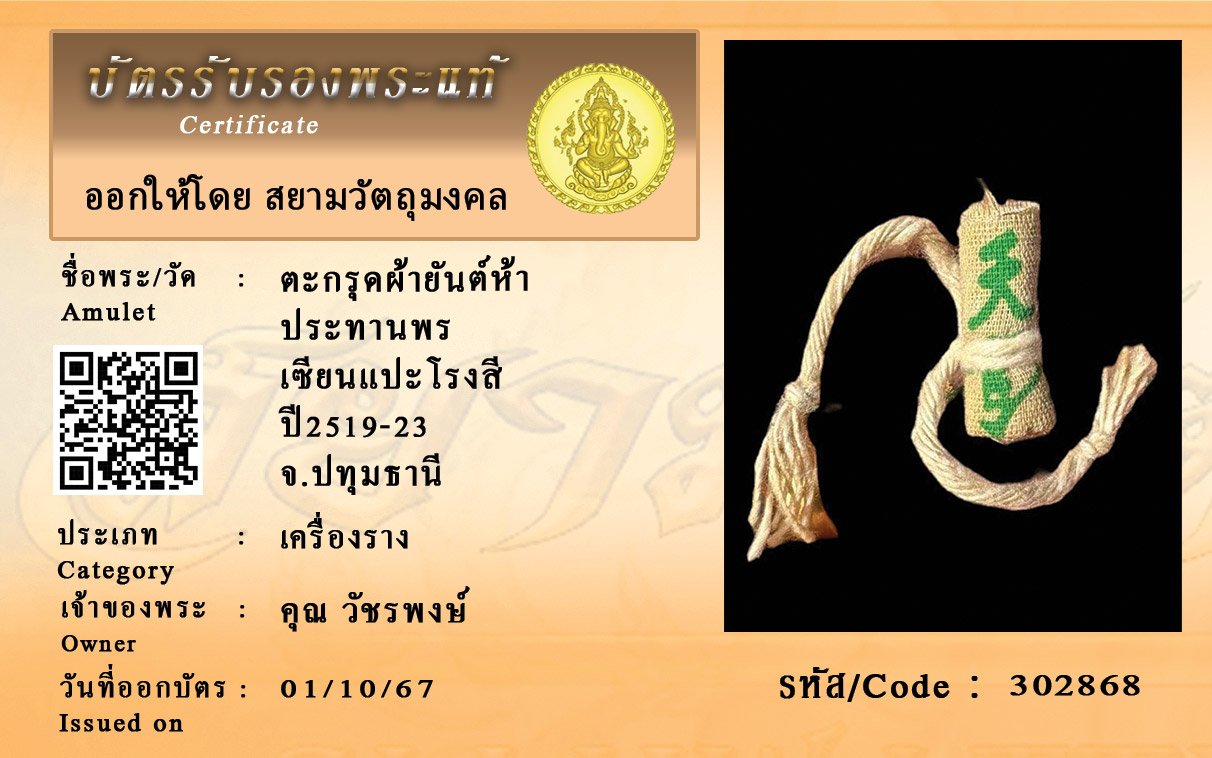 รหัสสินค้า : 302868 ตะกรุดผ้ายันต์ห้า ประทานพร เซียนแปะโรงสี ปี2519-23 จ.ปทุมธานี