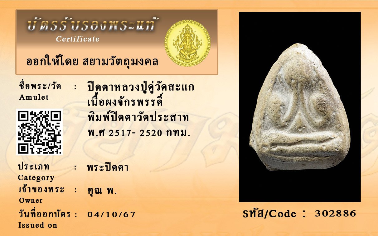 รหัสสินค้า : 302886 ปิดตาหลวงปู่ดู่วัดสะแก เนื้อผงจักรพรรดิ์ พิมพ์ปิดตาวัดประสาท พ.ศ 2517- 2520 กทม.
