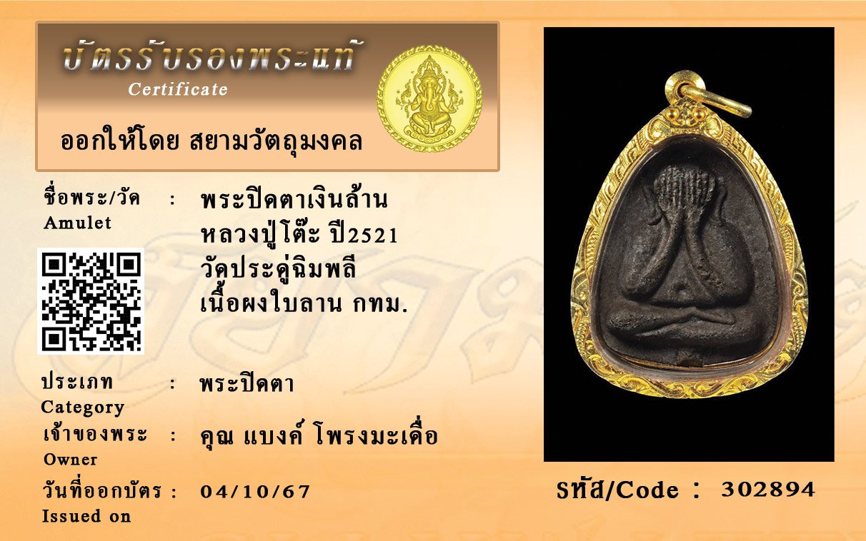 รหัสสินค้า : 302894 พระปิดตาเงินล้าน หลวงปู่โต๊ะ ปี2521 วัดประดู่ฉิมพลี เนื้อผงใบลาน กทม.