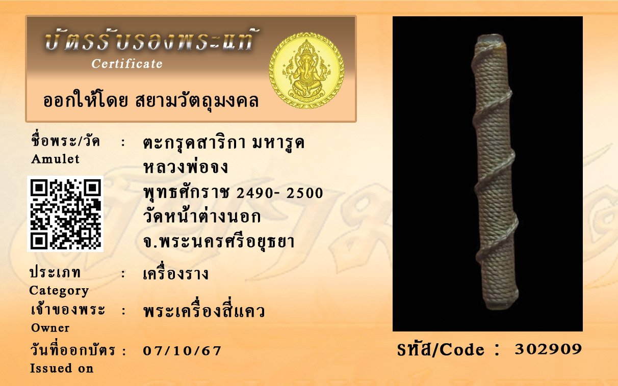 รหัสสินค้า : 302909 ตะกรุดสาริกา มหารูด หลวงพ่อจง พุทธศักราช 2490- 2500 วัดหน้าต่างนอก จ.พระนครศรีอยุธยา