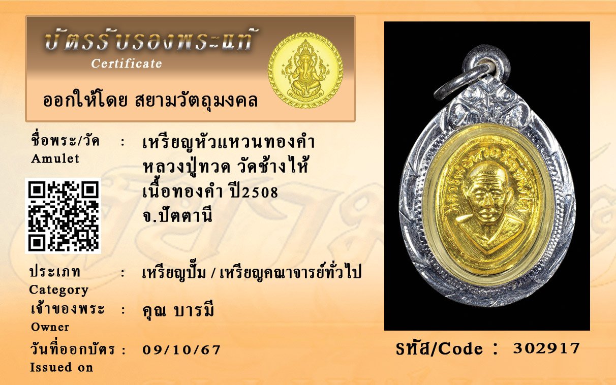 รหัสสินค้า : 302917 เหรียญหัวแหวนทองคำ หลวงปู่ทวด วัดช้างไห้ เนื้อทองคำ ปี2508 จ.ปัตตานี