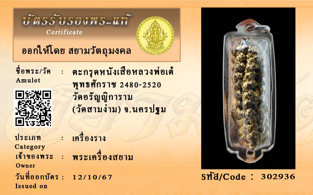 รหัสสินค้า : 302936 ตะกรุดหนังเสือหลวงพ่อเต๋ พุทธศักราช 2480-2520 วัดอรัญญิการาม (วัดสามง่าม) จ.นครปฐม