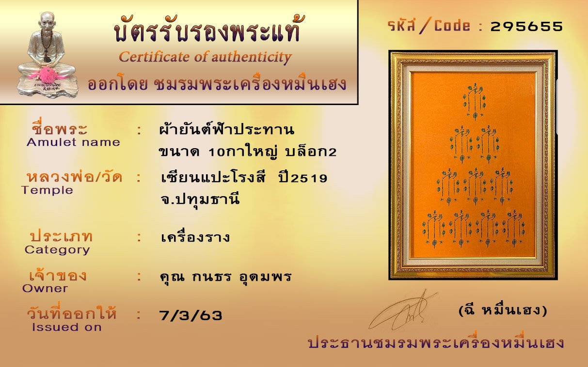 รหัสสินค้า : (295655) ผ้ายันต์ฟ้าประทาน 10กาใหญ่ บล็อก 2 เซียนแปะโรงสี ปี2519 จ.ปทุมธานี