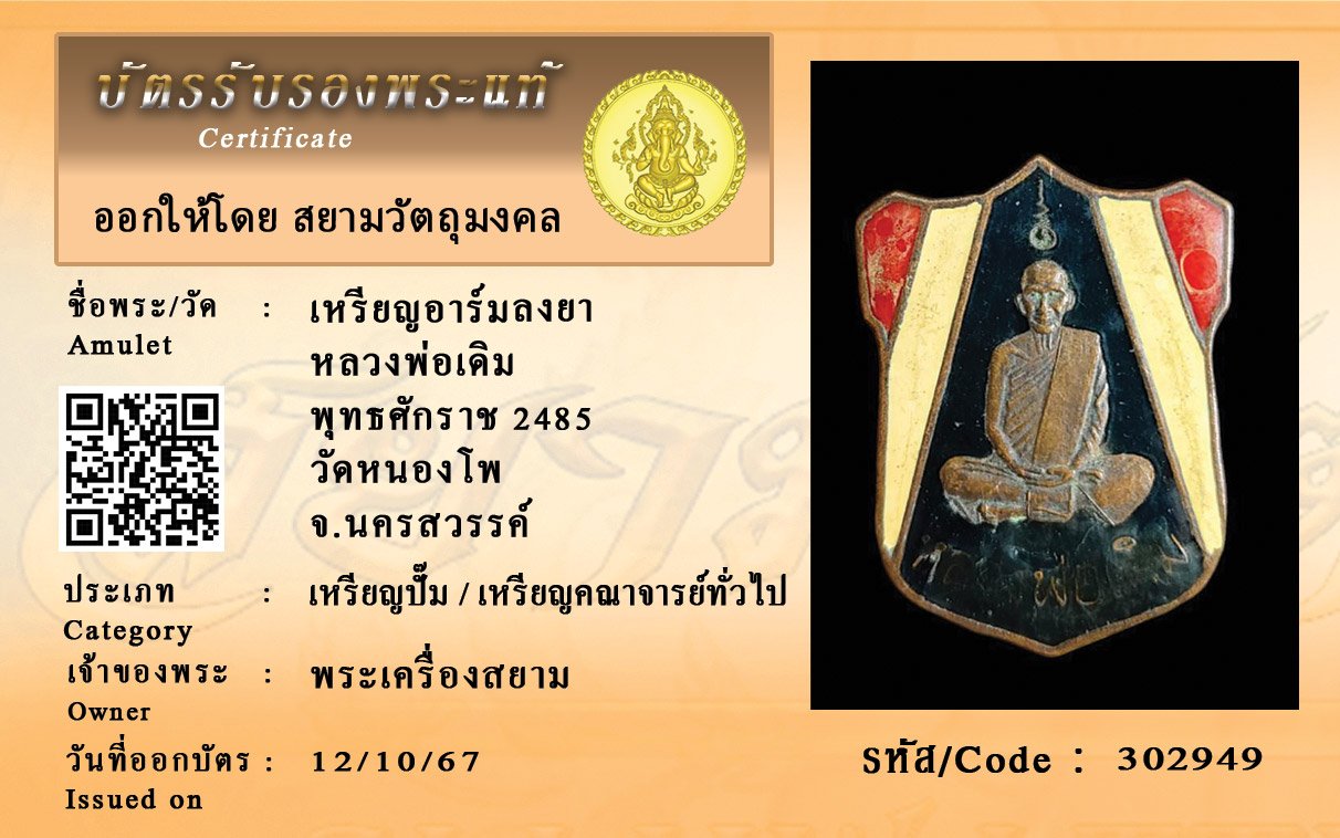 รหัสสินค้า : 302949 เหรียญอาร์มลงยา หลวงพ่อเดิม พุทธศักราช 2485 วัดหนองโพ จ.นครสวรรค์