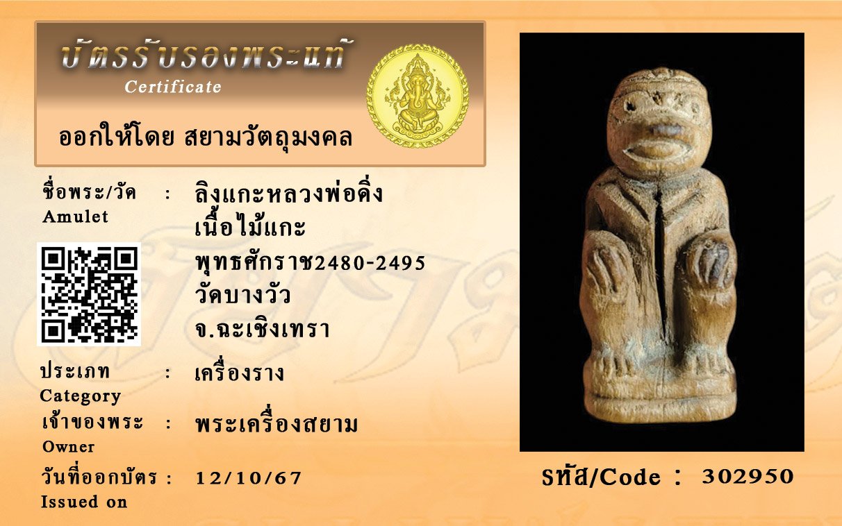 รหัสสินค้า : 302950 ลิงแกะหลวงพ่อดิ่ง เนื้อไม้แกะ พุทธศักราช2480-2495 วัดบางวัว จ.ฉะเชิงเทรา