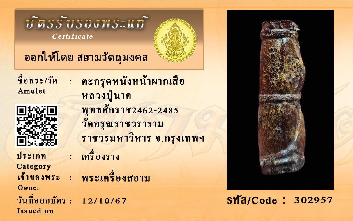 รหัสสินค้า : 302957 ตะกรุดหนังหน้าผากเสือ หลวงปู่นาค พุทธศักราช2462-2485 วัดอรุณราชวรารามราชวรมหาวิหาร จ.กรุงเทพมหานคร