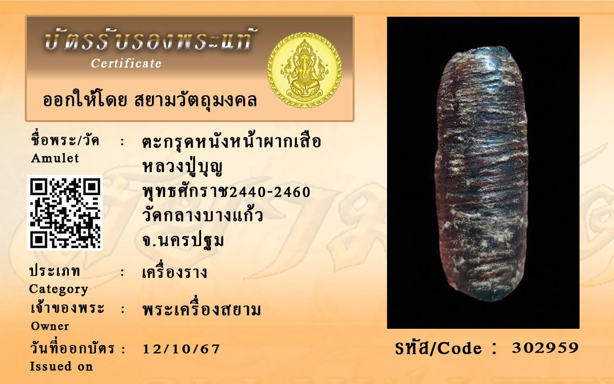 รหัสสินค้า : 302959 ตะกรุดหนังหน้าผากเสือ หลวงปู่บุญ พุทธศักราช2440-2460 วัดกลางบางแก้ว จ.นครปฐม