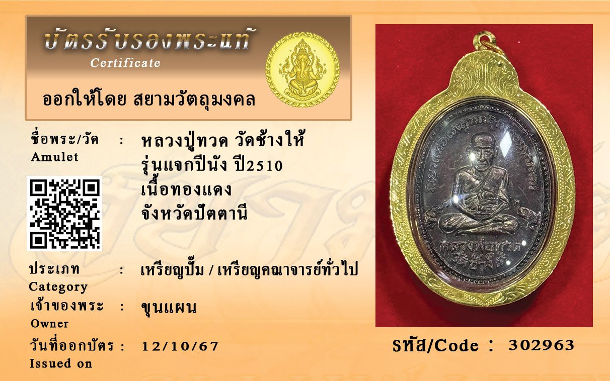 รหัสสินค้า : 302963 หลวงปู่ทวด วัดช้างให้ รุ่นแจกปีนัง ปี2510 เนื้อทองแดง จังหวัดปัตตานี