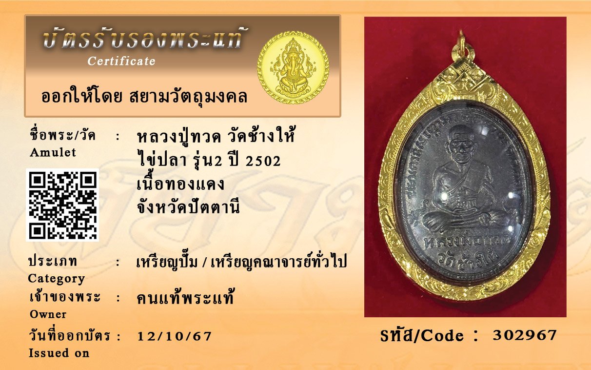 รหัสสินค้า : 302967 หลวงปู่ทวด วัดช้างให้ ไข่ปลา รุ่น2 ปี 2502 เนื้อทองแดง จังหวัดปัตตานี