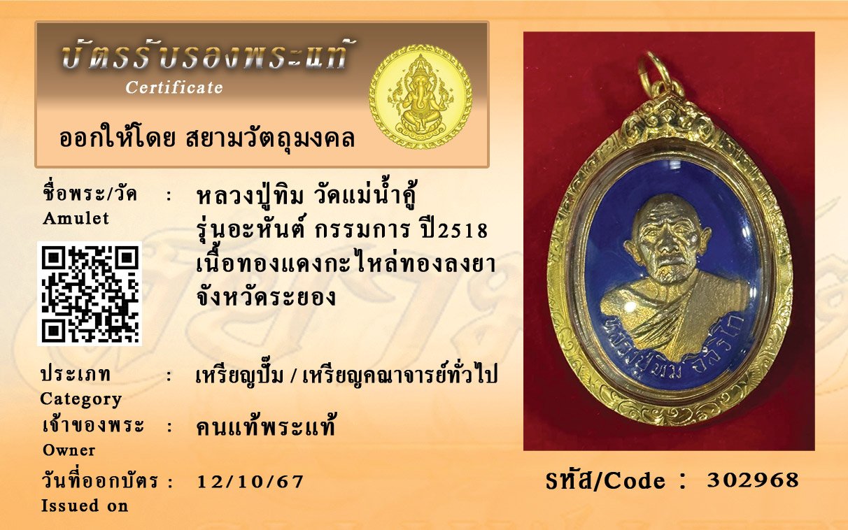 รหัสสินค้า : 302968 หลวงปู่ทิม วัดแม่น้ำคู้ รุ่นอะหันต์ กรรมการ ปี2518 เนื้อทองแดงกะไหล่ทองลงยา จังหวัดระยอง