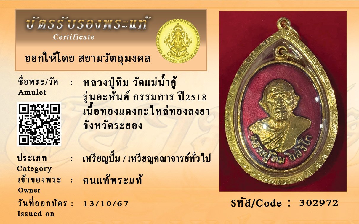 รหัสสินค้า : 302972 หลวงปู่ทิม วัดแม่น้ำคู้ รุ่นอะหันต์ กรรมการ ปี2518 เนื้อทองแดงกะไหล่ทองลงยา